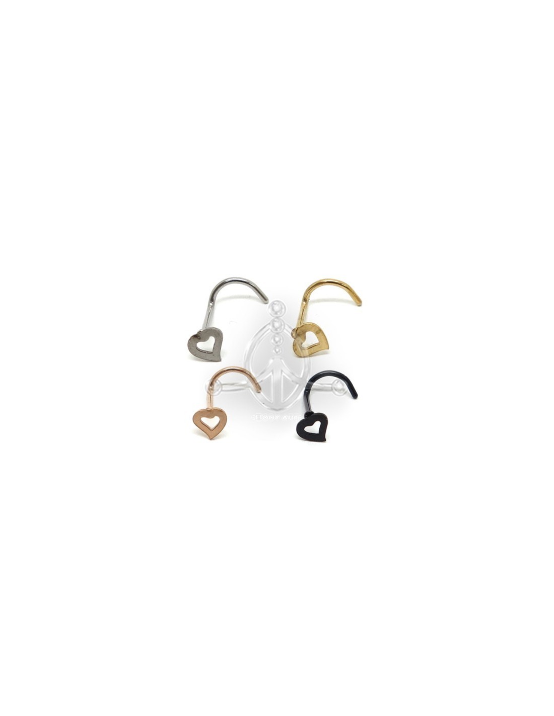 Nostril con pequeño corazón, de acero quirúrgico 316L crudo o anodizado en negro, rosa y oro. Medida: 0.8x6.5 mm.