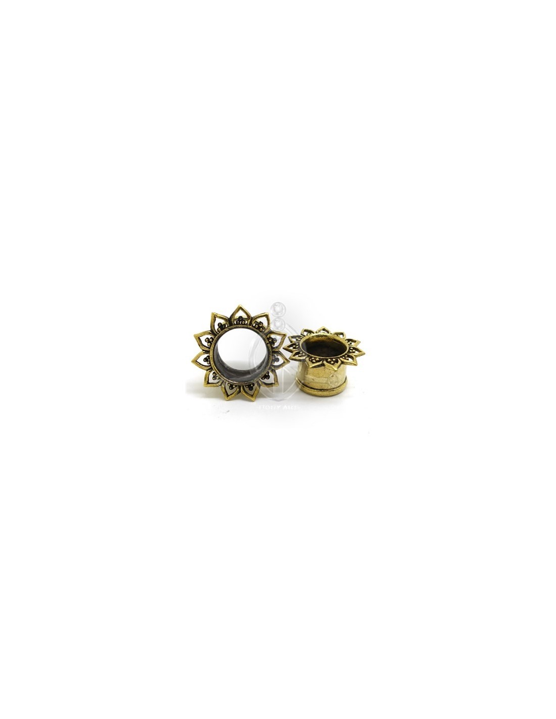 Dilatación Plug Étnico. Diseño FLOR SOL. Material: Aleación de cobre y cinc libre de níquel, plomo y cadmio. Medidas: 12 y 14