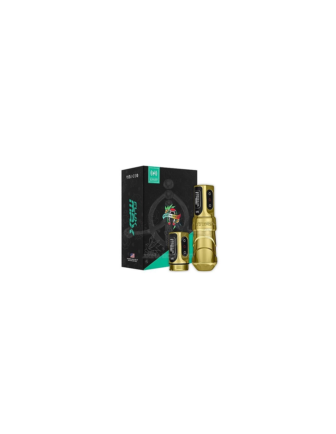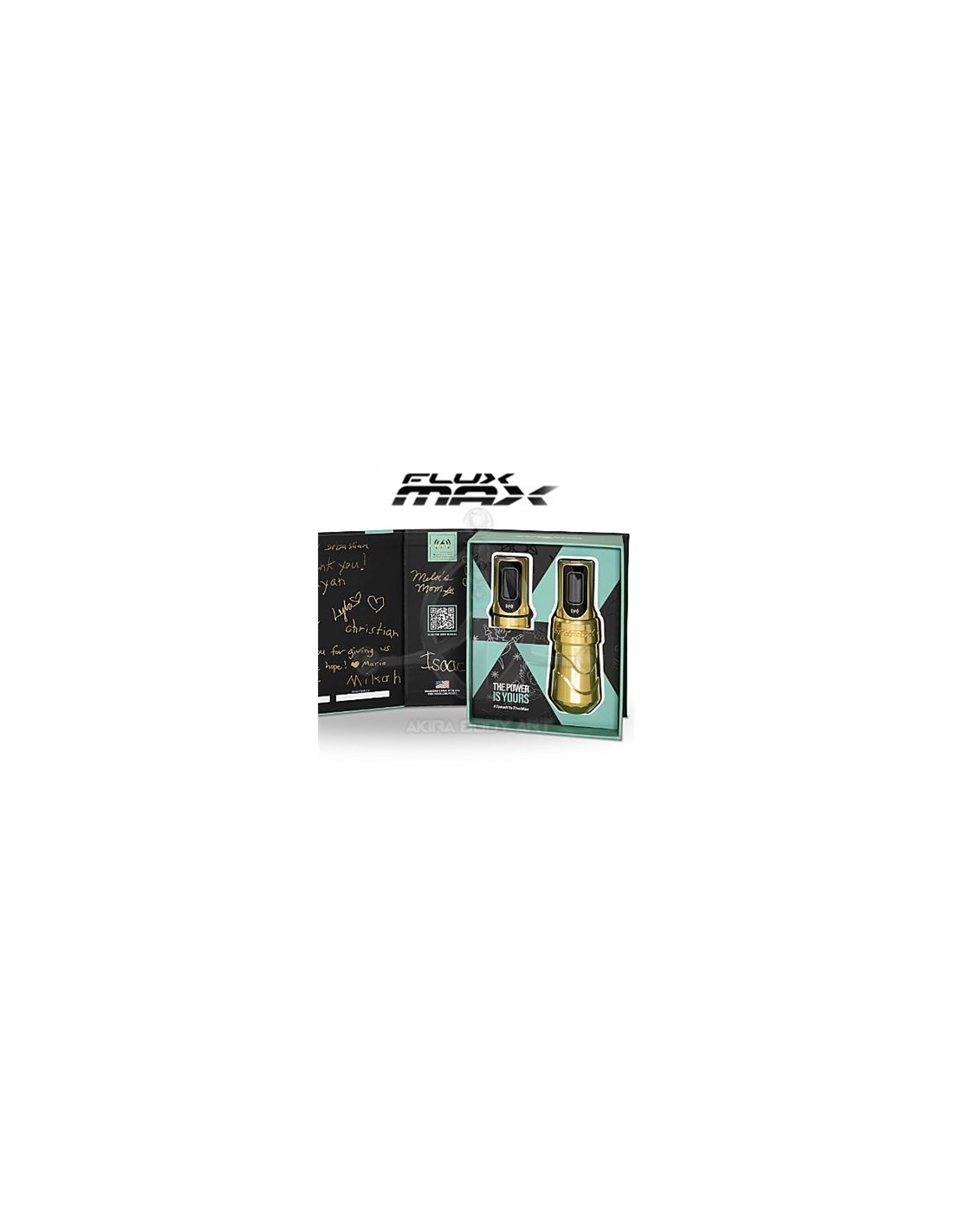 Spektra FLUX MAX GOLDEN InalámbricaMáquina Rotativa Spektra FLUX MAX (EDICIÓN ESPECIAL GOLDEN), de FK Irons. Conexión de carga USB-C recorrido, profundidad de aguja y Give (elasticidad) completamente ajustables. Duración de batería: 10 horas (Según uso).**Cada compra de esta edición especial de FK Irons Flux Max ayuda a luchar contra el cáncer infantil financiando una hora de investigación sobre el cáncer pediátrico a través de la Fundación Hope vs Cancer.**A través de la pantalla y el panel táctil actualizado de la PowerBolt II, se puede ver y acceder al menú para ajustar varios parámetros sin necesidad de utilizar la aplicación Darklab.Las opciones del menú incluyen:- Pantalla principal de potencia en hertzios (Hz) o voltios (V).- Configuración del voltaje: muestra el voltaje en incrementos de 0,1 o 0,5 V.- Pedal: compatible con Darklab Killswitch (Ref: WITCH).- Posibidad de ajuste del eGive (dureza de golpeo): nivel 0 (eGive desactivado) hasta los niveles 1, 2 y 3 (golpe duro, medio y suave). Tras el ajuste, la unidad detectará la tensión de los cartuchos utilizados y ejecutará un algoritmo para garantizar que el eGive sea coherente con el nivel elegido.- Cronómetro: controla el tiempo de la sesión. - Orientación de la pantalla: selecciona el funcionamiento a la izquierda o a la derecha.- Rango de voltaje de 4 a 12 V.Características principales:- Posibilidad de selección de recorridos (Stroke) en el momento de compra: 3,2m 4,0 y 4,5 mm.- Color: Edición Especial Gold – Hope vs Cancer.- Conexión: Inalámbrica, usa cable USB-C para carga de las baterías.- Baterías intercambiables.- Pantalla digital OLED y panel táctil.- Hasta 10 horas de duración (Según uso).- Opciones del menú: visualización de la potencia principal, visualización de la potencia secundaria, configuración del voltaje, pedal, eGive, cronómetro, orientación de la pantalla y transporte.- Material: Aluminio 6061 T6.- Compatible con cartuchos universales.- Dimensiones de Flux Max y PowerBolt II (L x A): 126 x 58 mm.- Peso Flux Max y PowerBolt II: 205 g.- Diseñada y fabricada en los Estados Unidos.La caja incluye:1 - Cuerpo máquina FLUX MAX2 - Powerbolt II1 - Cable de carga USB-C¡ADVERTENCIA sobre la Batería!**Cada compra de esta edición especial de FK Irons Flux Max ayuda a luchar contra el cáncer infantil financiando una hora de investigación sobre el cáncer pediátrico a través de la Fundación Hope vs Cancer.**