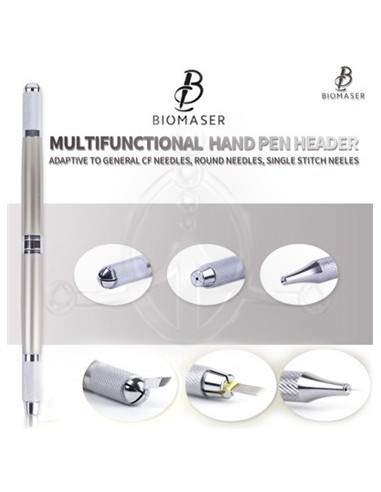 Nuevo Pen Micro-Blading 3-en-1Pen para Micro-Blading Tres-en-Uno con cabezal multifunción, fabricada por Biomaser. Para agujas CF (corte biselado), RL y de una sola punta. Perfecto para Microblading en cejas y delineación de ojos. Unidad suelta.Aspecto exquisito, sensación cómoda de la mano, adaptación multiuso. Longitud total, 142 mmLas piezas que no están ya montadas están dentro del PEN.