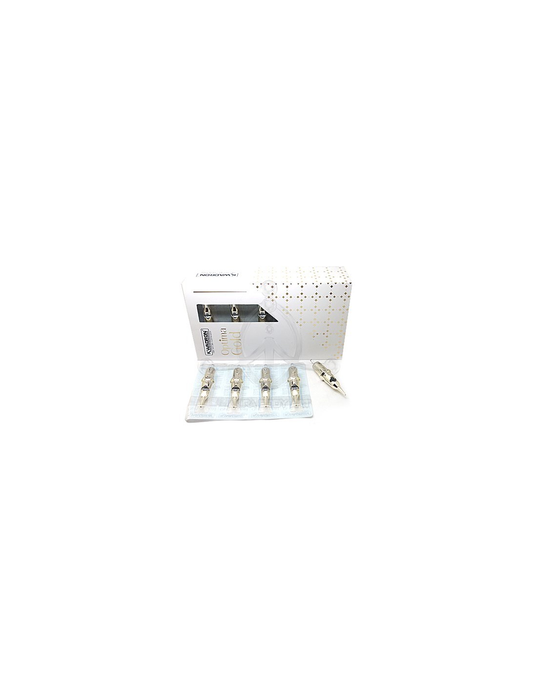Cartuchos de agujas PMU Optima Gold de KWADRON. Cartuchos desechables RL-LT (Round Liner - Long Taper). Caja de 20 unidades. Contiene membrana protectora.