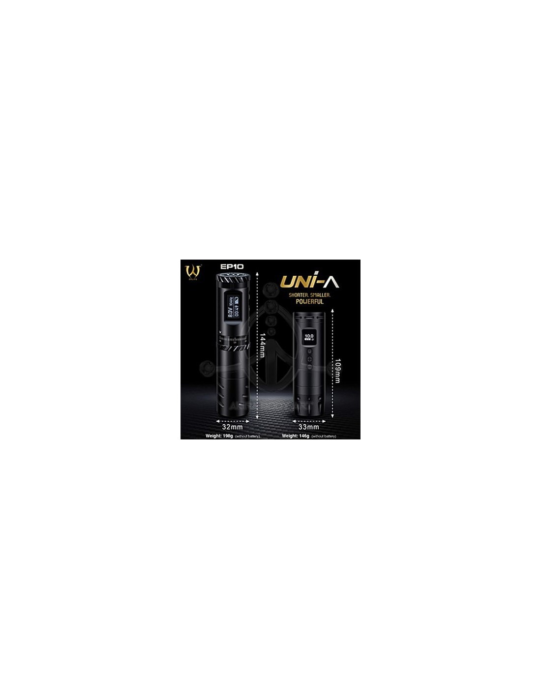 Maquina Rotativa UNI-A - WirelessMáquina para tatuar de forma inalámbrica, modelo UNI-A de AVA. Pen ligero y de tamaño pequeño. Stroke de 3,5 mm, Tamaño: 109 mm X 33 mm. Peso: 198 gr (Sin Batería). Color negro.Características principales:- Motor: AVA OEM Metal Brush DC Motor- Material: Aluminio aeronáutico- Potencia entrada: 5W- Velocidad del Motor: 10500 rmp- Stroke: 3.5mm- Salida de la aguja: 0-5mm- Tipo de Batería: 18500 Litio-ion capacidad nominal: 1600mAh- Tamaño: 33mm*109mm- Peso: 198gr (sin batería)El producto incluye: 1 x máquina2 x pilas recargables1 x cargador de batería con cable USB1 X Maletín de transporte.¡ADVERTENCIA sobre la Batería!