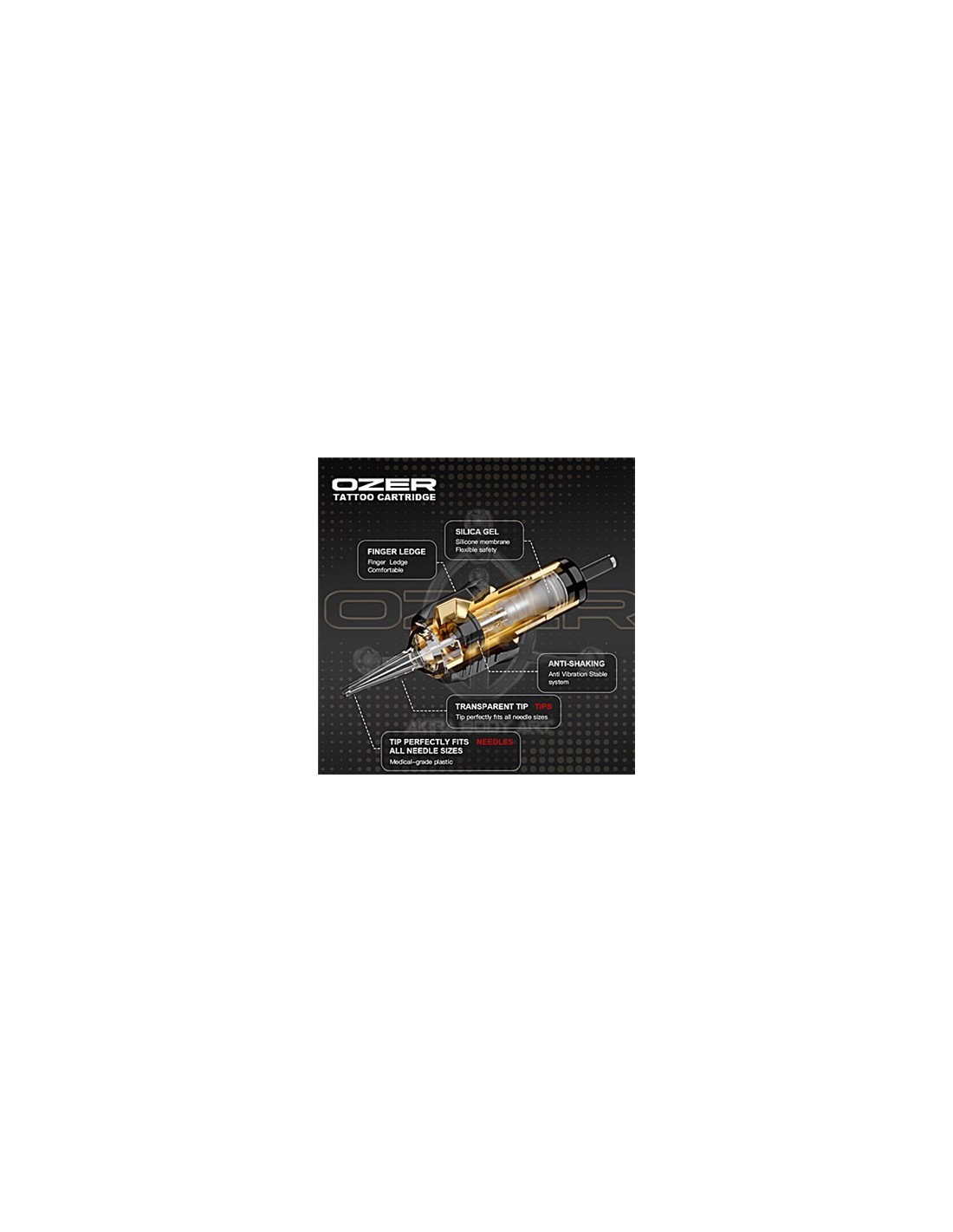 Cartuchos de alta calidad fabricado por Ozer. Acero inoxidable de grado medico. Cuenta con membrana de seguridad de tensión media. Modelo MC (Magnum Curve). Caja de 20 unidades.