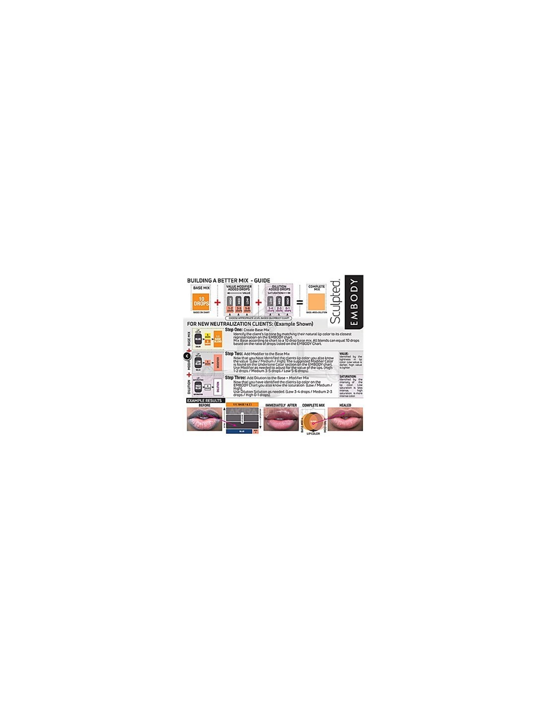 Set EMBODY - No usar en piel humanaSet de pigmentos Perma Blend Luxe para técnicas simuladas de Micropigmentación en LABIOS. Contiene 8 botellas de 15 ml: 4 pigmentos base de color, 3 modificadores de color y 1 diluyente,se deben combinar entre sí.Cada set contiene una tarjeta de color fácil de usar para una rápida selección de tonos.El set incluye:- Base 1- Base 2- Base 3- Base 4- Mod 1- Mod 2- Mod 3- AdjustComposiciones:- Base 1:Aqua, Yellow 138 (CI: 56300), White 6 (CI:77891), Acrylates Copolymer, Glycerin, Triethanolamine, Yellow 180 (CI:21290), Oleth9, Benzyl Alcohol, Sodium Bisulfite, Paraffinum Liquidum, Ammonium Hidroxide (PH Regulator), Lecithin, Eucalyptus Oil.- Base 2: Aqua, Yellow 180 (CI:21290), White 6 (CI:77891), Acrylates Copolymer, Glycerin, Triethanolamine, Orange 73 (CI: 561170), Oleth9, Benzyl Alcohol, Sodium Bisulfite, Paraffinum Liquidum, Ammonium Hidroxide (PH Regulator), Lecithin, Eucalyptus Oil.- Base 3: Aqua, White 6 (CI:77891), Orange 73 (CI: 561170), Acrylates Copolymer, Glycerin, Triethanolamine, Red 254 (CI: 56110), Yellow 180 (CI:21290), Oleth9, Benzyl Alcohol, Sodium Bisulfite, Paraffinum Liquidum, Ammonium Hidroxide (PH Regulator), Lecithin, Eucalyptus Oil.- Base 4: Aqua, White 6 (CI:77891), Red 254 (CI: 56110), Acrylates Copolymer, Glycerin, Triethanolamine, Yellow 180 (CI:21290), Oleth9, Benzyl Alcohol, Sodium Bisulfite, Paraffinum Liquidum, Ammonium Hidroxide (PH Regulator), Lecithin, Eucalyptus Oil.- MOD 1: White 6 (CI:77891), Aqua, Acrylates Copolymer, Yellow 138 (CI: 56300), Glycerin, Triethanolamine, Oleth9, Benzyl Alcohol, Sodium Bisulfite, Lecithin, Paraffinum Liquidum,Ammonium Hidroxide (PH Regulator), Eucalyptus Oil.- MOD 2: White 6 (CI:77891), Aqua, Acrylates Copolymer, Glycerin, Triethanolamine, Yellow 180 (CI:21290), Oleth9, Benzyl Alcohol, Sodium Bisulfite, Red 254 (CI: 56110), Lecithin, Paraffinum Liquidum, Ammonium Hidroxide (PH Regulator), Eucalyptus Oil.- MOD 3: White 6 (CI:77891), Aqua, Acrylates Copolymer, Glycerin, Triethanolamine, Oleth9, Benzyl Alcohol, Sodium Bisulfite, Lecithin, Red 254 (CI: 56110), Paraffinum Liquidum, Ammonium Hidroxide (PH Regulator), Orange 36 (CI: 11780), Eucalyptus Oil.- Adjust: Aqua, Glycerin, Sodium Benzoate, Citric Acid, Potassium Sorbate.Los usuarios son los únicos responsables de la aplicación adecuada de los pigmentos. Los pigmentos de Perma Blend NO son válidos para micropigmentación o aplicación sobre piel humana. Por lo tanto, Akira Body Art no se hace responsable del uso indebido de los mismos.