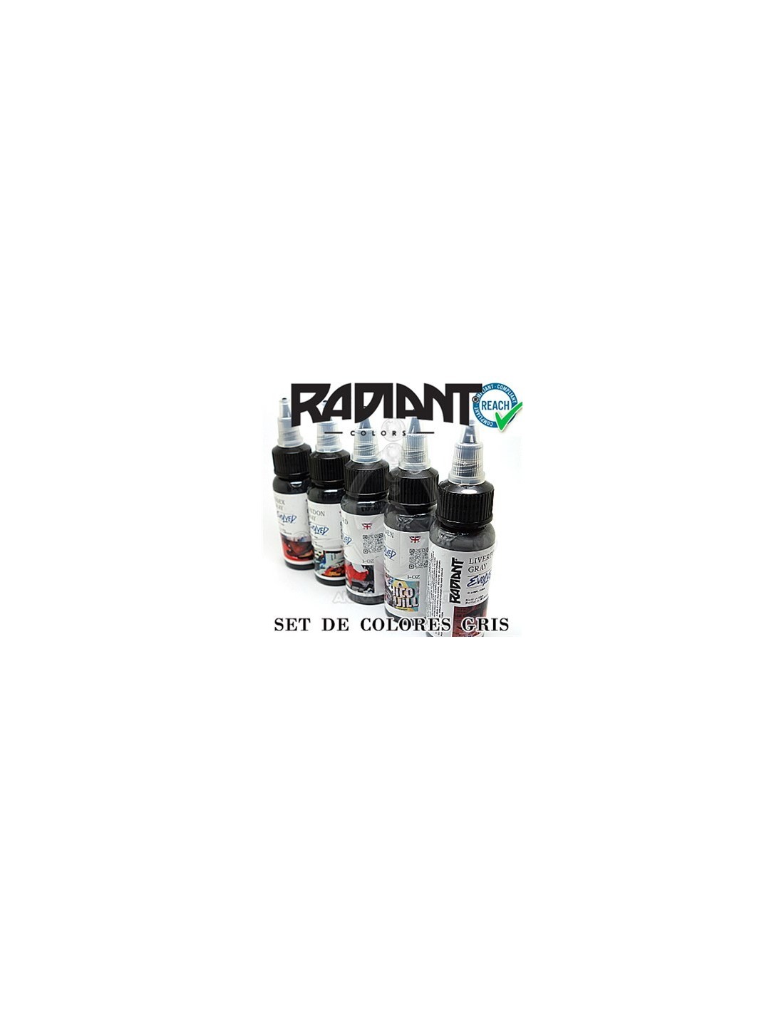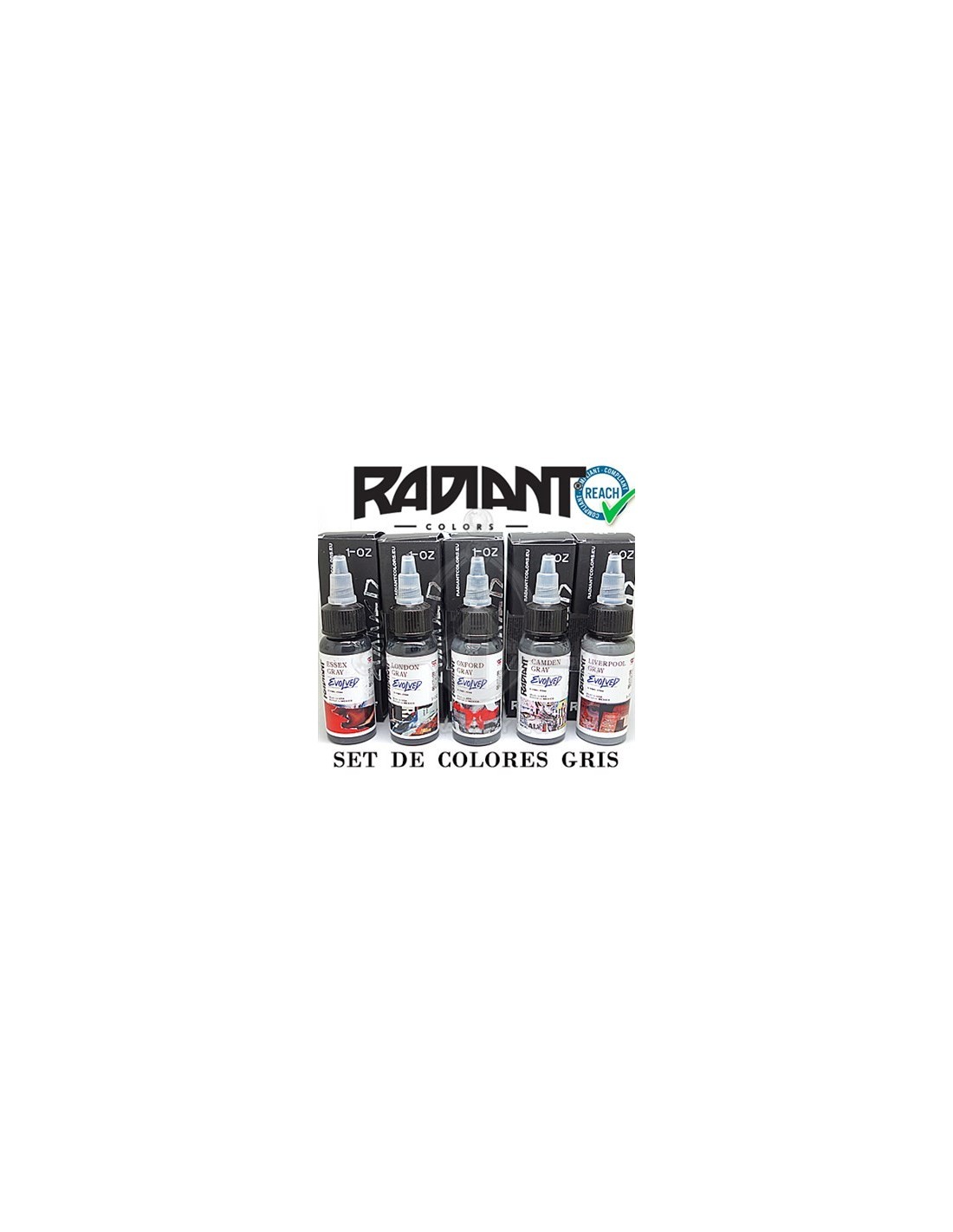 Set de Tinta Radiant GRISSet de Grises fabricado por Radiant. Gama de grises color. Fabricada en Estados Unidos. El set contiene 5 botes de 30 ml (1 Oz)El kit está compuesto por:1) LIVERPOOL GRAY2) OXFORD GRAY3) CAMDEN GRAY4) LONDON GRAY5) ESSEX GRAYComposición (Pigmento):- White 6 (CI:77891)- Black 7 (CI:77266)Composición (Excipientes):- Agua- Alcohol etílico- Alcohol de bencilo- Contiene níquel- Contiene cromoCumple con el Reglamento (UE) 2020/2081 de la comisión de 14 de diciembre de 2020. Este Reglamento es obligatorio en todos sus elementos y directamente aplicable en cada Estado miembro. (Entró en vigor el 4 de enero de 2022)