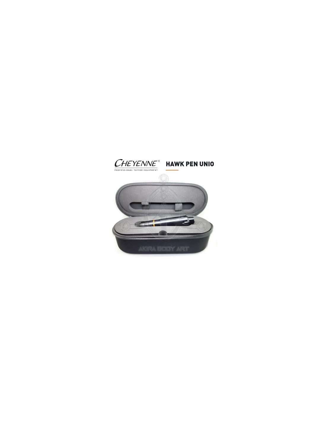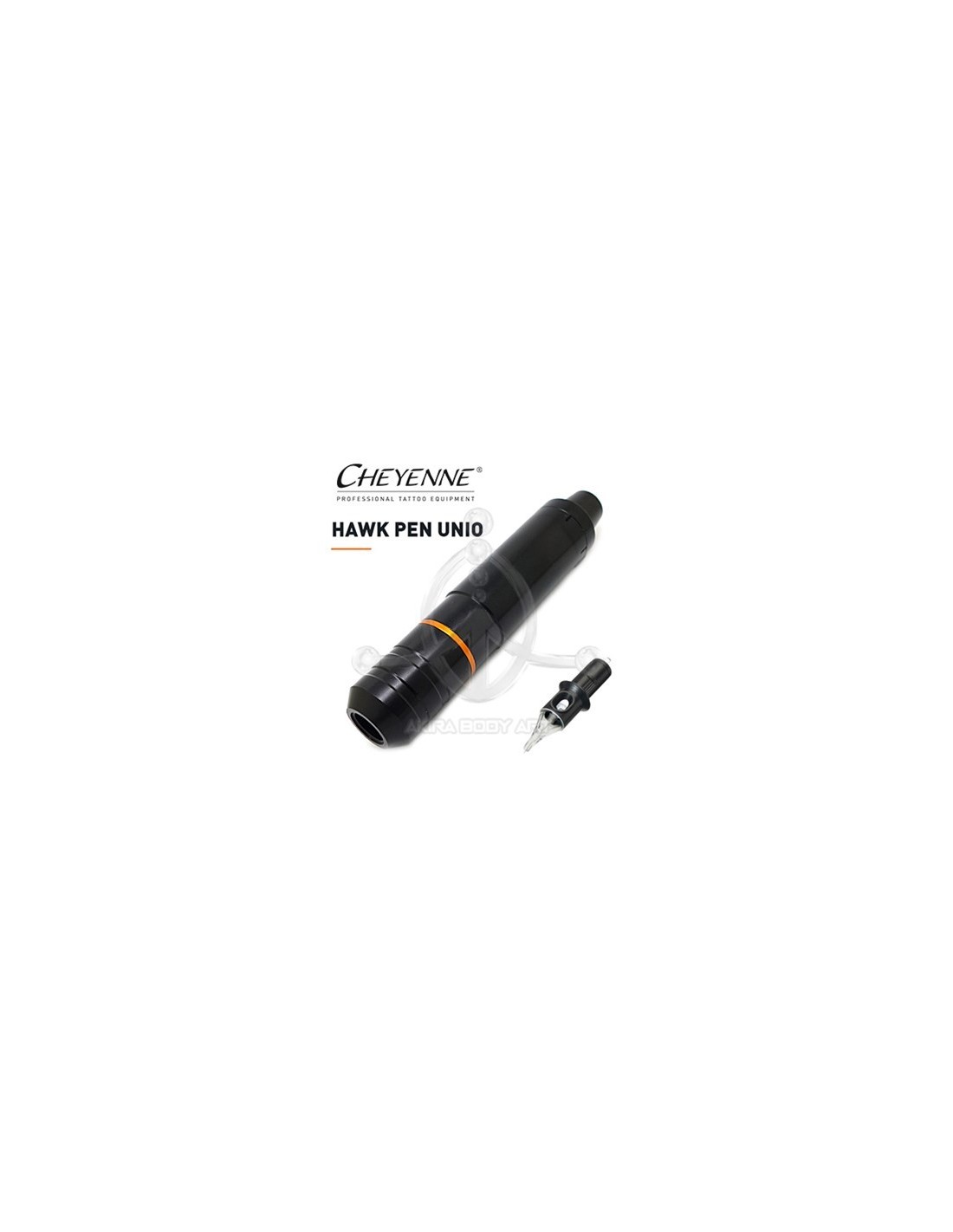 HAWK PEN UNIO de CheyenneLa HAWK PEN UNIO de Cheyenne es la combinación de HAWK Spirit para sombreados y la HAWK Thunder para líneas y rellenos. Recorrido ajustable de 2,5 mm a 4,0 mm. Medidas: 29 mm (diámetro) y 138 mm (longitud). Peso: 160 g. aprox. Color: Negro.Principales características:- Motor: motor DC- Conexión: jack de 3.5 mm- Recorrido ajustable de 2,5 mm a 4,0 mm- Amplio ancho de banda de frecuencia de 65 a 140 Hz- Compatible con los tres grips desechables de Cheyenne. (Ref: CH-ERGO1), (Ref: CH-ERGO2) y (Ref: CH-ERGO1)- Profundidad de aguja ajustable de 0 a 4,0 mm- Grip extraíble para una limpieza sencilla- Inhibición de movimiento (evita caídas debido al desplazamiento accidental)- Fácil de cubrir- Robusto estuche de transporte Cheyenne- Fabricado según la norma de dispositivos médicos (ISO 13485)- Garantía de 24 meses- Fabricado en AlemaniaIncluido en la Caja:1 Máquina Rotativa HAWK PEN UNIO1 Estuche de transporte Cheyenne1 Cable conexión Jack 3,5 mm (Fuentes originales de Cheyenne)1 Cable adaptador Jack 3,5 mm a Jack 6,3 mm1 Llave allen5 Tornillos de recambio para ajuste de grip5 O-ring de 16 mm5 O-ring de 19 mm1 Manual de instrucciones