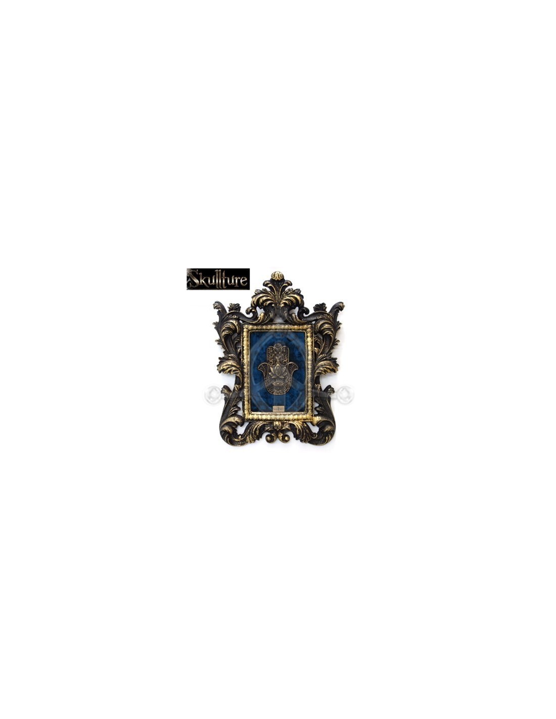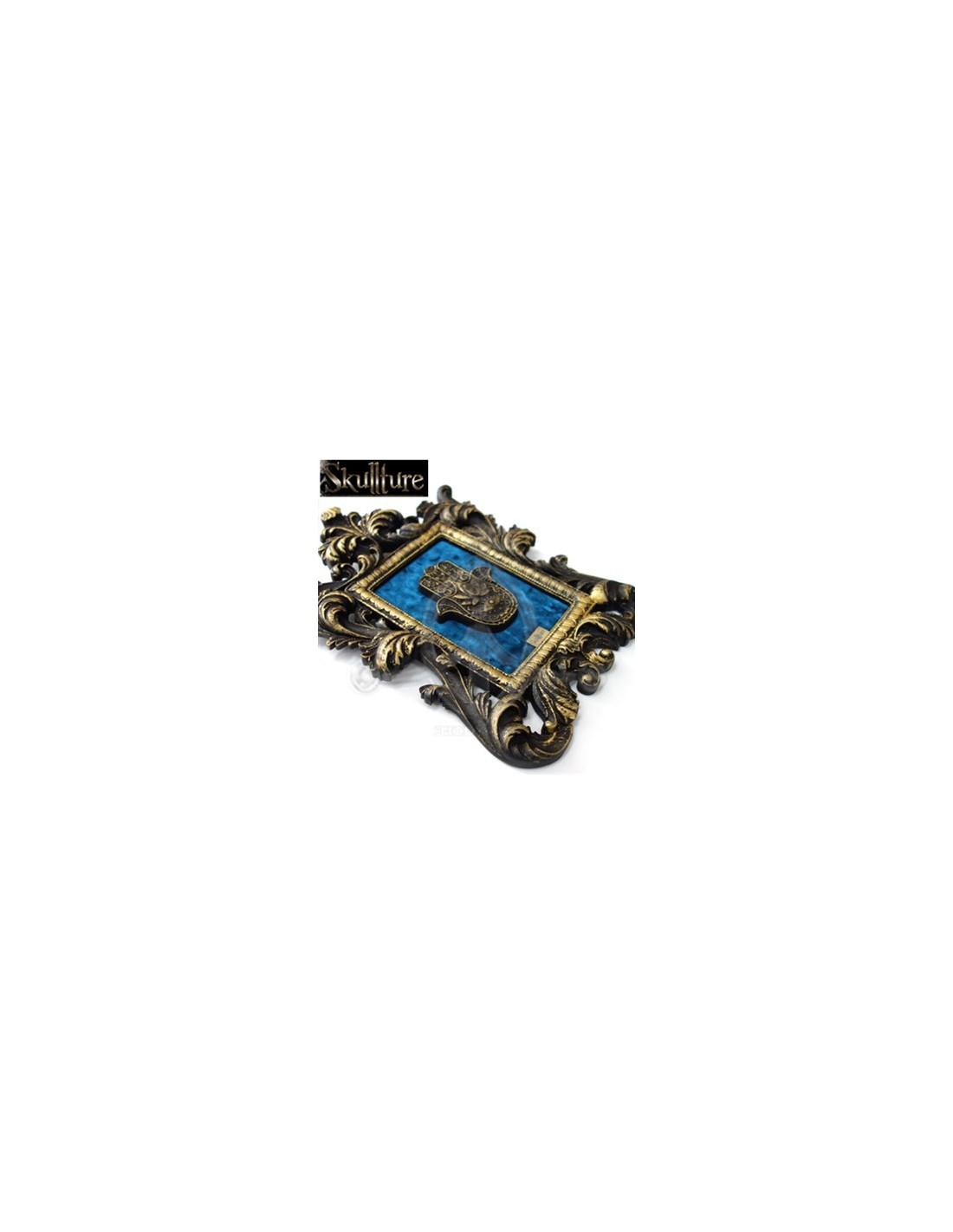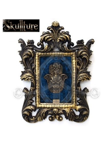 New Decoración SKT1 GOLDEN KEYS-SKULL GENÉRICO SKT1 €85.00 Marco de poliuretano de resina dorado con calavera sin mandíbula y llaves doradas en fondo de terciopelo negro. Dimensiones (ancho x alto x grosor): 25x20x6 cm. Peso: 770grs Add to basket