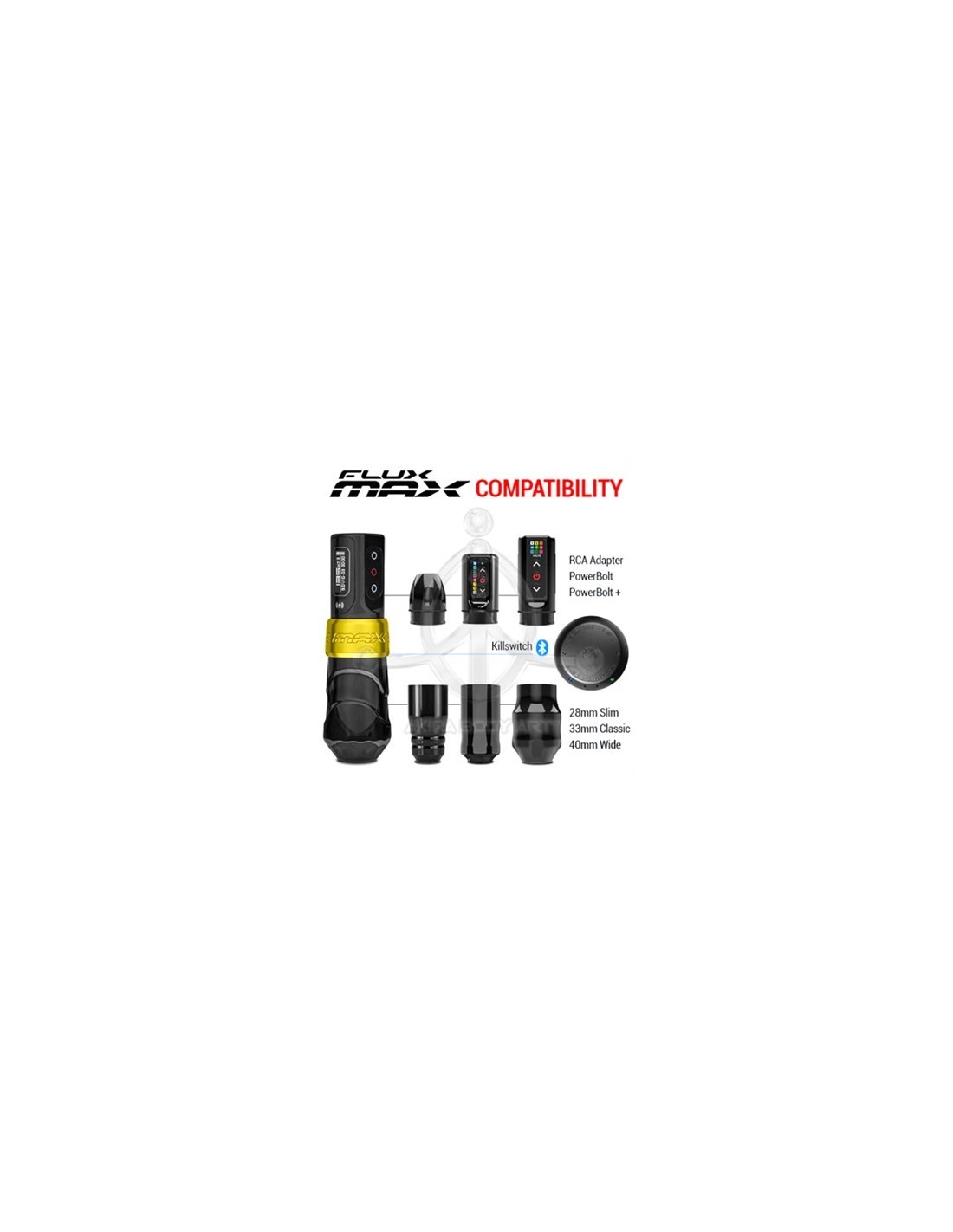 Aplicación DARKLAB solo compatible con IOSSpektra FLUX MAX InalámbricaMáquina Rotativa Spektra FLUX MAX de FK Irons. Conexión de carga USB-C recorrido, profundidad de aguja y eGive (elasticidad) completamente ajustables. Duración de batería: 10 horas (Según uso).A través de la pantalla y el panel táctil actualizado de la PowerBolt II, se puede ver y acceder al menú para ajustar varios parámetros sin necesidad de utilizar la aplicación Darklab.Las opciones del menú incluyen:- Pantalla principal de potencia en hertzios (Hz) o voltios (V).- Configuración del voltaje: muestra el voltaje en incrementos de 0,1 o 0,5 V.- Pedal: compatible con Darklab Killswitch (Ref: WITCH).- Posibidad de ajuste del eGive (dureza de golpeo): nivel 0 (eGive desactivado) hasta los niveles 1, 2 y 3 (golpe duro, medio y suave). Tras el ajuste, la unidad detectará la tensión de los cartuchos utilizados y ejecutará un algoritmo para garantizar que el eGive sea coherente con el nivel elegido.- Cronómetro: controla el tiempo de la sesión. - Orientación de la pantalla: selecciona el funcionamiento a la izquierda o a la derecha.- Rango de voltaje de 4 a 12 V.Características principales:- Posibilidad de selección de recorridos (Stroke) en el momento de compra: 3,2m 4,0 y 4,5 mm.- Color: Stealth y Gold / Stealth- Conexión: Inalámbrica, usa cable USB-C para carga de las baterías.- Baterías intercambiables.- Pantalla digital OLED y panel táctil.- Hasta 10 horas de duración (Según uso).- Opciones del menú: visualización de la potencia principal, visualización de la potencia secundaria, configuración del voltaje, pedal, eGive, cronómetro, orientación de la pantalla y transporte.- Material: Aluminio 6061 T6.- Compatible con cartuchos universales.- Dimensiones de Flux Max y PowerBolt II (L x A): 126 x 58 mm.- Peso Flux Max y PowerBolt II: 205 g.- Diseñada y fabricada en los Estados Unidos.La caja incluye:1 - Cuerpo máquina FLUX MAX1 - Powerbolt II1 - Cable de carga USB-C¡ADVERTENCIA sobre la Batería!