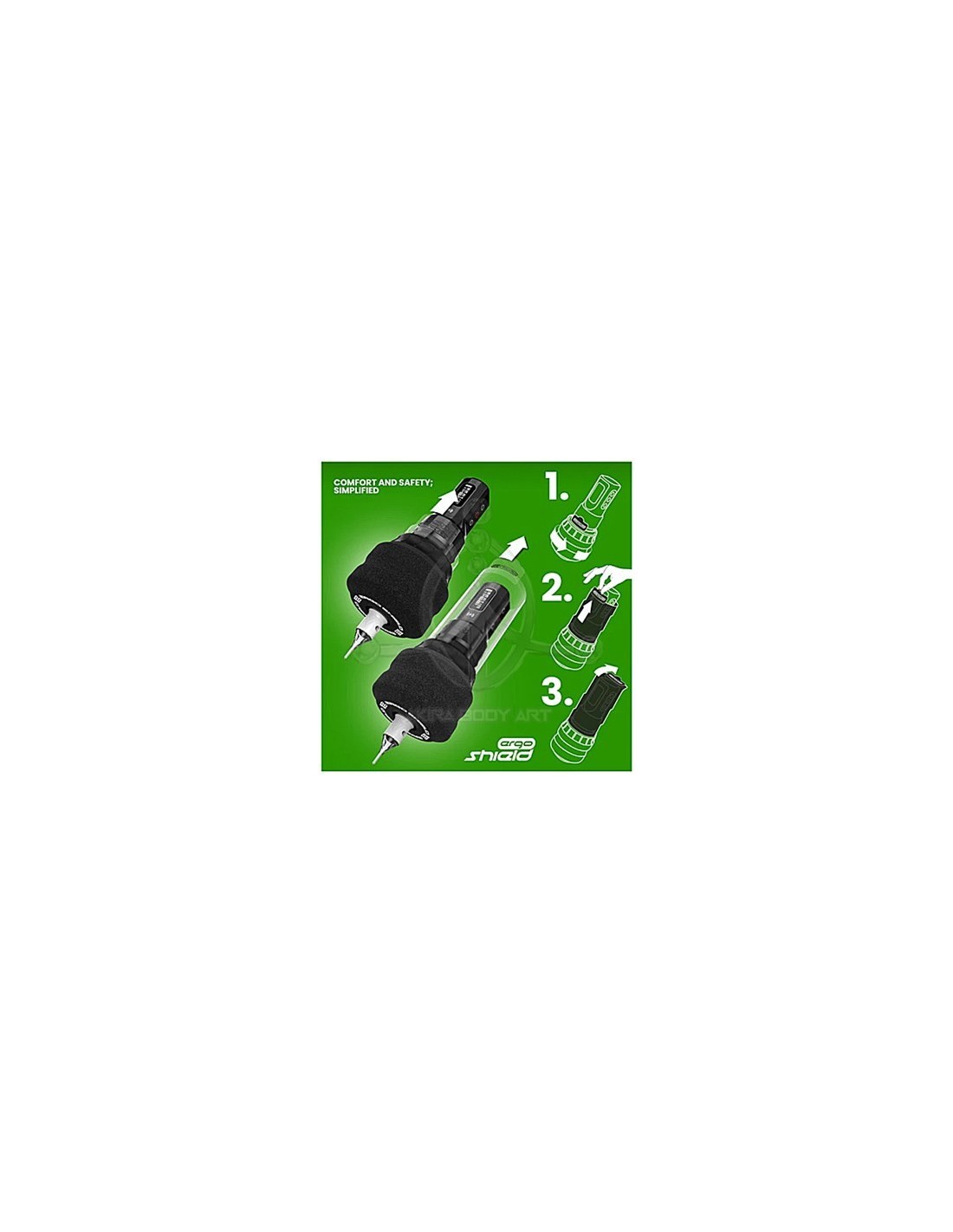 Grips DesechablesErgo Shield - 60mmGrips desechables Ergo Shield fabricados en espuma por Fk Irons. Reduce la fatiga. Sistema de protección para contaminación cruzada. Caja de 24 unidades.Intrucciones de Uso:1. Enrosca el grip desechable en la maquina.2. Pellizca la lengüeta entre dos dedos y tira de ella hacia arriba para liberar el plástico protector.3. Dóblalo sobre la parte superior de la batería.4. Séllalo con la pegatina.Compatible con todas las máquinas inalámbricas de FK IRONS