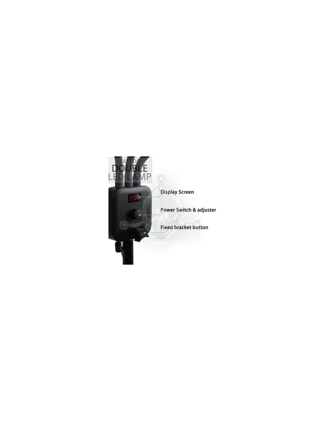 Lámpara LED de doble brazoLámpara de estudio cuyo diseño único de doble brazo te permite ubicar tu iluminación preferida exactamente donde la necesitas. Más brillante, estable y sensible que otras lámparas similares del mercado, esta luz versátil proporciona una vista sin sombras de tu área de trabajo.PRINCIPALES CARACTERÍSTICAS:- Lámpara LED súper-ligera, portátil, brillante, estable y ultra-sensible. - No hay que esperar a que se enfríe. Al terminar el trabajo, desmontas, empacas y listo. Ideal tanto para Tattoo como para micropigmentación.- Dispone de un soporte adicional para teléfono o iPad (no es compatible con iPad-Pro) y así grabar tu trabajo con libertad, precisión y comodidad.- Dos modos de iluminación LED: Brillante y Ambiental incluye un mando de giro continuo para un ajuste muy preciso de la atenuación de la iluminación. - Permite múltiples configuraciones de Altura.- Incluye conexión USB para mantener tu dispositivo (móvil o iPad) cargado.- Bolsa de transporte: viene en su propio estuche de transporte para desmontar y llevar donde lo necesites.ESPECIFICACIONES:- Potencia: 40 W- CRI: RA> 90 (Índice de Reproducción Cromática valor máximo, 100): - CCT: 3000K - 6000K (+/- 200K) (Temperatura de Color, en grados Kelvin 6500K es un valor de luz blanca estándar en pantallas digitales)- Voltaje de entrada: DC 18V / 3A- Voltaje de CA: 110V-220V, 50HZ / 60HZ- T.C .: -5ºC a 40ºC- Botón de ajuste continuo- Altura ajustable: 35cm-72.5cm- Materiales: cuerpo de la lámpara de aluminio, cubierta de ABS- Vida útil: 50,000 horas