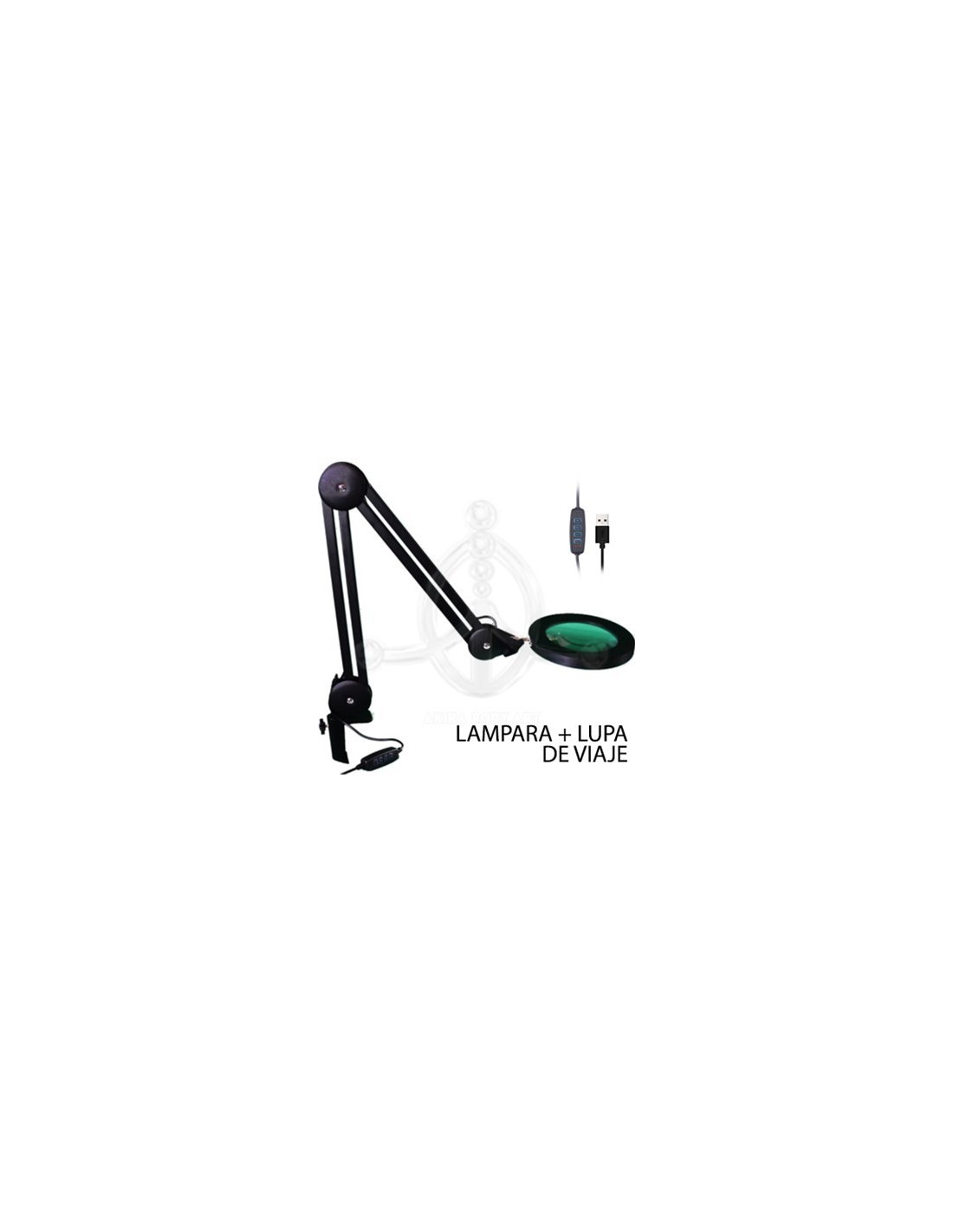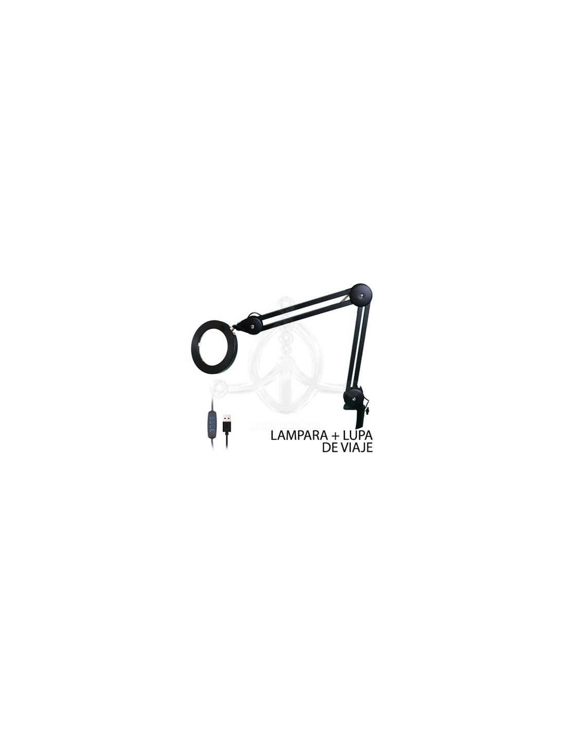 Lámpara-Lupa USB negraPequeña lámpara portátil con aumento de x1.75 (3 dioptrías). La lente de vidrio de 10,5cm está rodeada por un anillo de luz LED atenuable y ajustable con la botonera del cable a tres temperaturas de color diferente.Características principales:- Luz LED - La luz LED ofrece varias ventajas: un consumo de energía inferior a 10 vatios, incluso con la máxima intensidad de luz a diferencia de la luz convencional, los LED nunca "se funden". Por esa razón, están integrados de forma permanente en la lámpara.- Brazo articulado de 60 cm de largo (24 pulgadas). Permite colocar e inclinar fácilmente el cabezal de la lámpara. - Abrazadera de mesa integrada que ahorra espacio y se ajusta al borde de superficies de entre 0,25 y 5,6 cm (0,1 a 2.2 pulgadas) de espesor.- Fuente USB – Todo se maneja desde la fuente de alimentación USB incluida (compatible CE). Utilizar cargadores USB. No se recomienda conectar a puerto USB de un PC, por ejemplo.