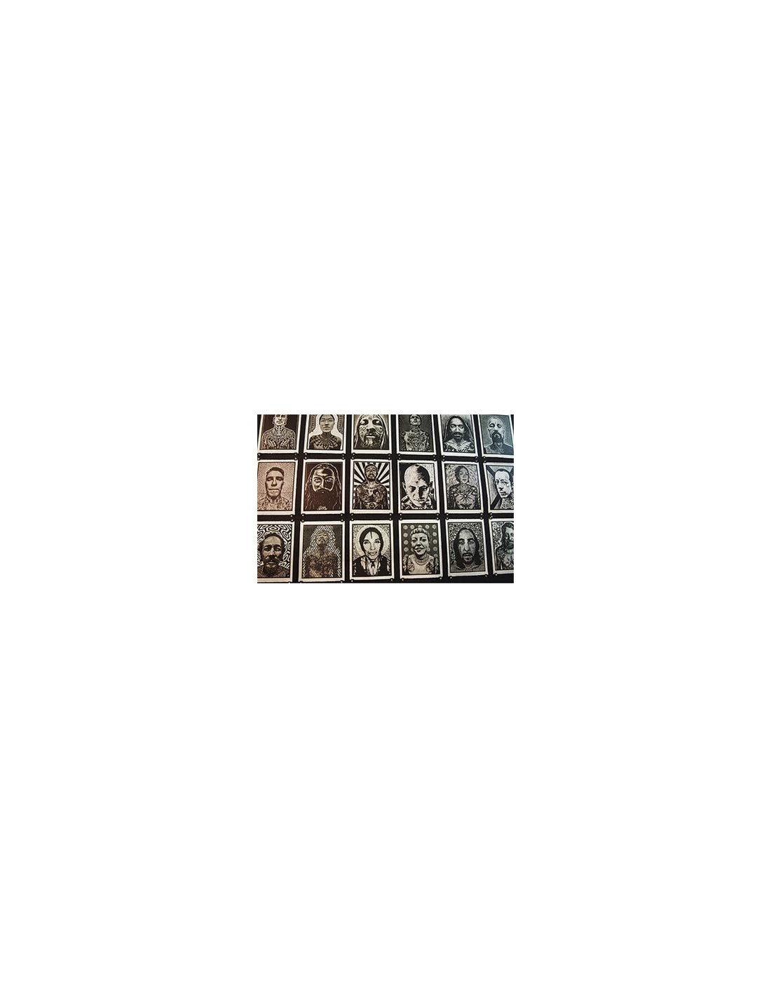 «The Woodcut Portraits», Alex BinnieInfluenciado por el gran tatuaje y los grabados tradicionales, Alex reconduce su habilidad y visión en una dirección totalmente nueva con un total de 36 grabados y una breve descripción de cada tema, podemos ver el formato clásico del grabado en un contexto contemporáneo.Copias originales de 45x60cms, impresas a mano por Alex en una prensa de impresión victoriana sobre papel japonés. Edición limitada.