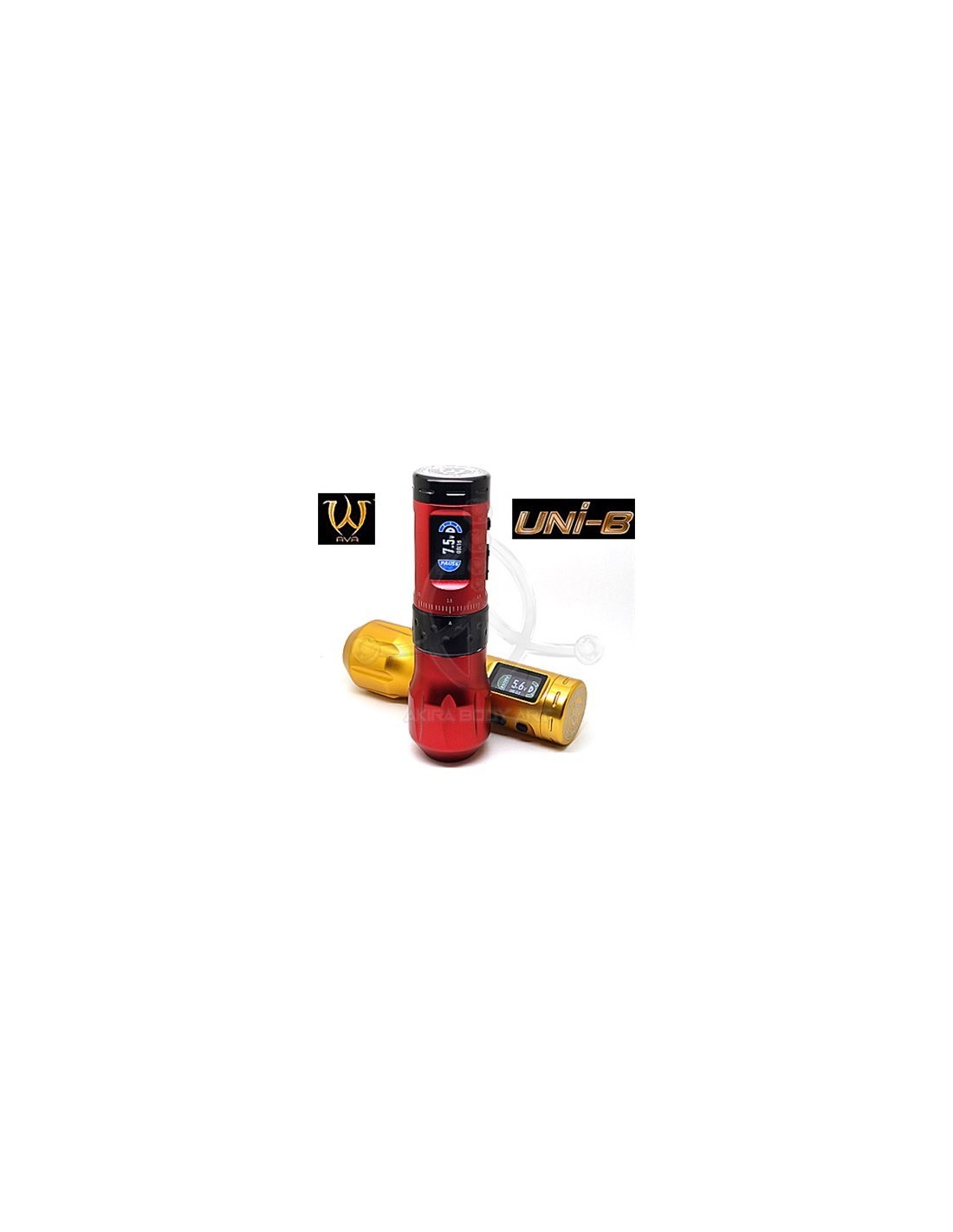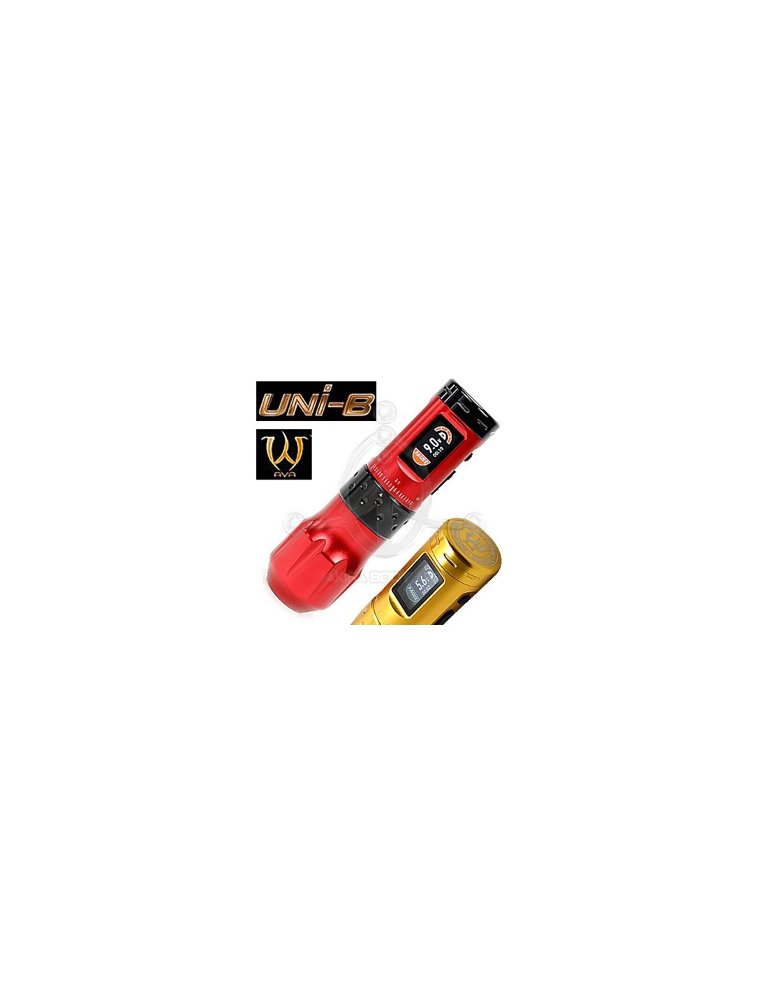 Equipo reacondicionado, embalaje y producto en estado muy bueno.Maquina Rotativa UNI-B - WirelessMáquina inalámbrica tipo pen de AVA, modelo UNI-B. Stroke regulable de 2,5 mm a 4,5 mm. Pantalla en color HD con temporizador, voltaje, carga y hertzios. Funcion de rebote para dañar menos cada tipo de piel. Grip antideslizante. Medidas: 128 mm X 38 mm.Caraterísticas principales:- Motor AVA de corriente continua con escobillas- Velocidad del motor: 10500 rpm.- Batería reemplazable de 18500 de iones de litio. Mayor tiempo de trabajo. - Autonomía de trabajo: 6 - 8 horas (Según uso).- Voltaje de entrada: 5V / 2A.- Material: aluminio grado aeronaútico.- Stroke ajustable de 2,5 mm a 4,5 mm.- Pantalla en color HD: muestra voltaje, hertzios, tiempo y carga. Incluye recordatorio de batería baja.- Protrusión: 0-5 mm.- Peso: 190 g (sin batería).- Dimensiones: 128 mm X 38 mm.Función del temporizador:A: Inicia la temporización al encederse, mantiene los datos incluso al cambiar de batería.B: Restablecimiento del temporizador: mantener presionados ambos botones ``+´´ y ``-´´ durante 3 segundos.Ajuste de voltaje:A: Presionar el botón ``+´´ o ``-´´, aumenta o disminuye el voltaje en 0,1V.B: Mantener presionado el boton ``+´´ o ``-´´, aumenta o disminuye el voltaje en 1V.El producto incluye:1 x Máquina rotativa UNI-B2 x Baterías recargables1 x Cargador para baterías1 x Funda de transporte*El modelo en color ORO incluye 2 grips. Los demás modelos incluyen 1 grip.NOTA: para cambiar de agujas se debe SIEMPRE PARAR LA MÁQUINA. No introducir cartuchos si la máquina está en funcionamiento, se puede daña el mecanismo interno de la misma.