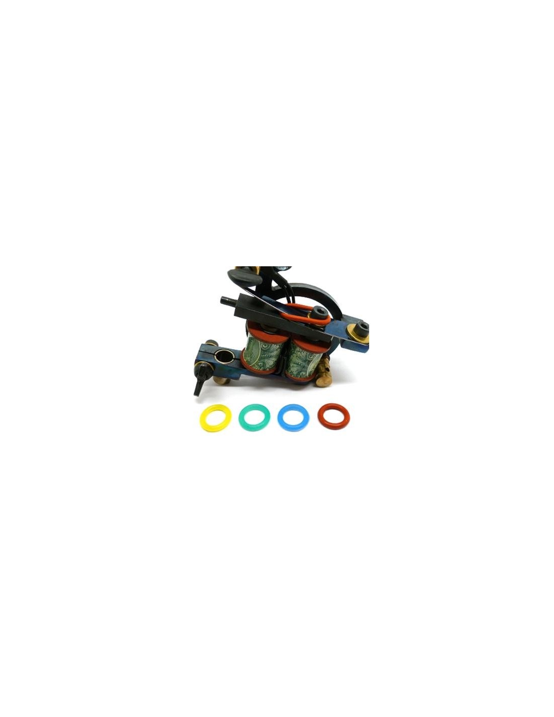 O-Rings de silicona en cuatro colores. La silicona permite un ajuste más fino de la máquina de tatuar. A diferencia de los convencionales de goma, los de silicona permiten que la máquina no se descalibre. Bolsas de 15 unidades.