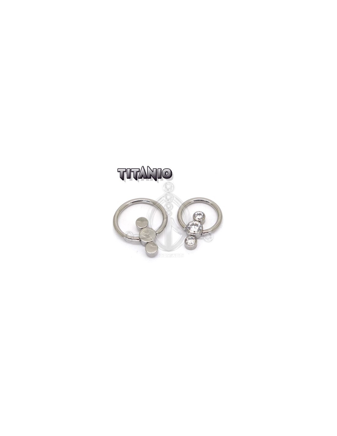 BCR (anillo cautivo) de Titanio con grupo de tres circonitas engastadas, color cristal (una grande y dos más pequeñas). Dos calibres disponibles: 1,2x8 mm y 1,2x10 mm